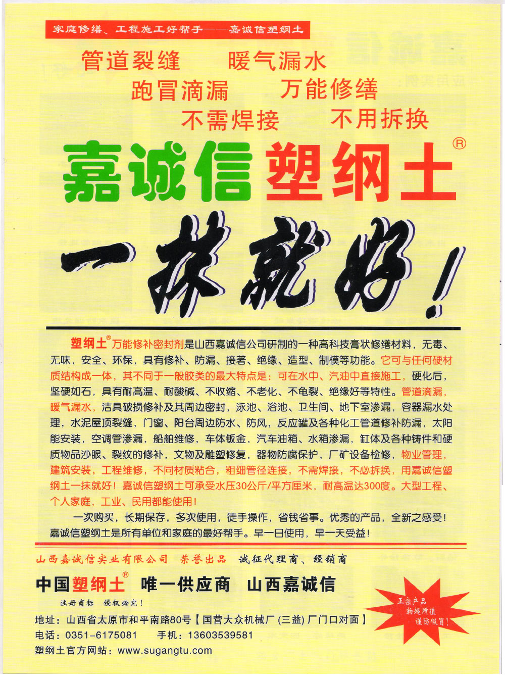 山西嘉誠(chéng)信實(shí)業(yè)有限公司多年來(lái),一直致力于“塑綱土”(國(guó)家注冊(cè)商標(biāo))修補(bǔ)密封劑在我國(guó)的推廣、應(yīng)用和研究,用戶遍布各地。長(zhǎng)期以來(lái),山西嘉誠(chéng)信實(shí)業(yè)有限公司投入大量人力、物力和財(cái)力,通過(guò)各種媒體及其它方式對(duì)”塑綱土”品牌進(jìn)行市場(chǎng)推廣和大力宣傳,使“塑綱土”品牌在業(yè)內(nèi)享有相當(dāng)知名度和影響力,深受廣大用戶的青睞和厚愛(ài)。