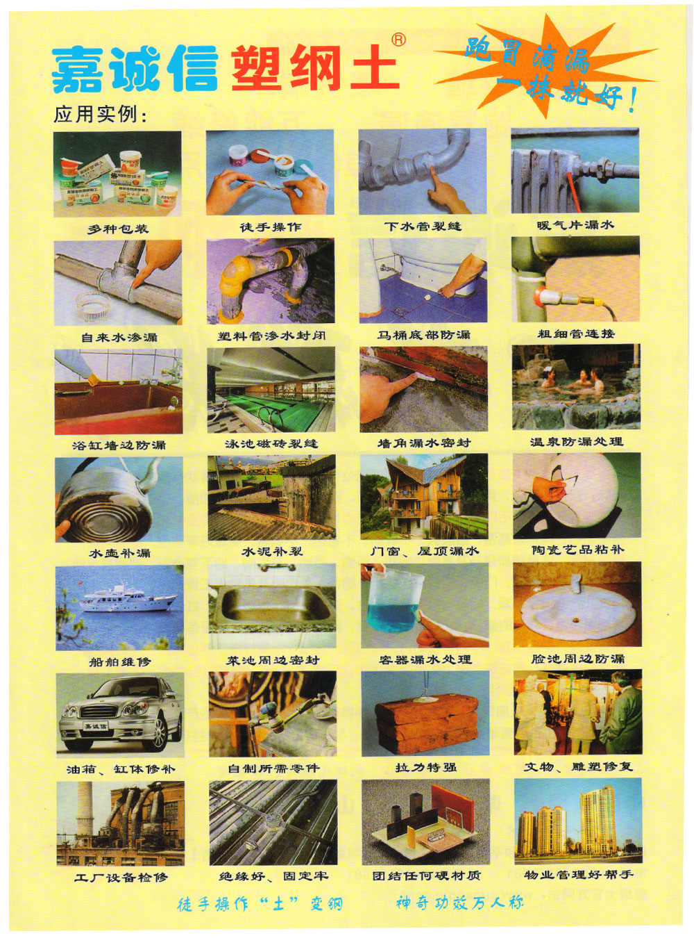 山西嘉誠(chéng)信實(shí)業(yè)有限公司多年來(lái)一直致力于塑鋼土的研究、開(kāi)發(fā),為塑鋼土在我國(guó)的推廣、應(yīng)用與普及立下了汗馬功勞!嘉誠(chéng)信早已成了塑鋼土的代名詞,嘉誠(chéng)信就是塑鋼土,塑鋼土就是嘉誠(chéng)信。跑冒滴漏滲就找嘉誠(chéng)信,要買(mǎi)塑鋼土還找嘉誠(chéng)信,已成為廣大用戶的共識(shí)!